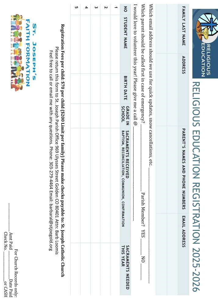Classes start in September. Registration forms can be found in the bulletin, church, and on the website during August. Forms can be returned to the Parish Office. Please contact Barbara Loomis at barbaral@stjoegold.org or 303-279-4464 if you have any questions or need to register mid-year.